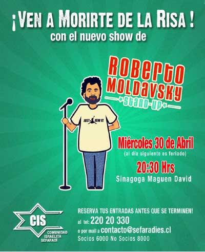 Atención al Público en CIS durante Pesaj, · Lunes 14: hasta las 14:00 horas En otro ámbito, La Comunidad Israelita Sefaradí lamenta el sensible fallecimiento de la Sra. Rosa Benadretti de Arama (Z”L).Enviamos nuestro gran abrazo a sus hijos, nietos, a nuestro socio, su hermano, Alberto Benadretti Cohen a toda la familia y del Sr. Denny Kiwi Heller (Z”L) quien participó durante años en nuestra comunidad. Nuestro próximo evento, abierto a toda la comunidad : Miércoles 30 de Abril ( al día siguiente: feriado!) – 20:30 horas en la Sinagoga : Gran Show Cómico de Roberto Moldavsky – socios 6000 - no socios 8000. Reserva ya tus entradas antes que se terminen . Tel 22020330 contacto@sefaradies.cl