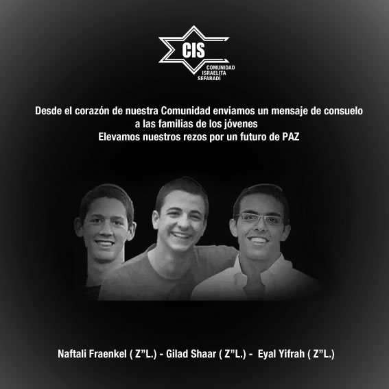 La edición del Jadashot impresa, decidimos hacerla sin colores, así como la imagen inicial de este boletín, adhiriéndonos al dolor que nos produce el trágico desenlace de nuestros jóvenes israelíes, y que a pesar de la distancia, sentimos que han tocado a nuestros hijos en nuestra tierra.