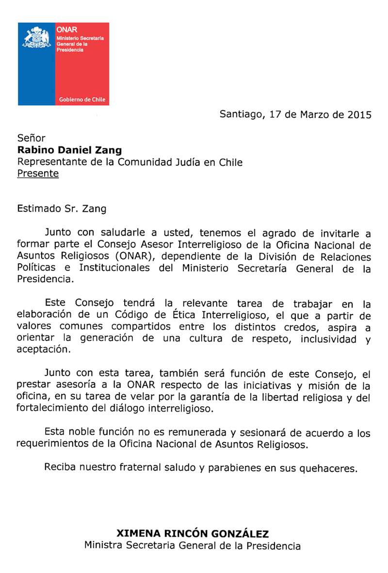 Tal como lo hice el día ayer a un reducido círculo me permito reiterar mi saludo a toda esta audiencia “este mail que me llena de alegría y es un honor para la Comunidad Sefaradí primero y luego para la CJCH que te hayan nombrado miembros del consejo asesor Interreligioso, muchas felicitaciones y esto es un reconocimiento a tu trabajo permanente en el ámbito sociocultural e interreligioso de nuestro país y por supuesto una oportunidad de aportar a través tuyo al desarrollo religioso de nuestro país.