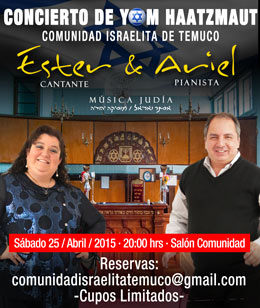 Queridos Lectores, Toda la Comunidad judía se reunió el pasado domingo 19 de abril en el EIM con motivo de la celebración de los 67 años de la Independencia del Estado de Israel; donde nuestro Rabino Daniel Zang realizó una plegaria por Medinat Israel. Como todos los años el stand del comité de damas de la Sefaradí arrasó con el apetito, los antojos y con algunas dietas… porque todo lo que había era mucho mas que tentador y demasiado sabroso. Felicitamos a Jeanette, Presidenta del Comité y a todas las damas que integran este grupo de cálidas mujeres que siempre hacen una bella labor comunitaria. Este martes hemos compartido el día mas oscuro de Israel, el día mas triste del año,Yom HaZicaron. En un emotivo acto junto al Rab Dani en la Embajada de Israel en Chile, recordamos y homenajeamos a tantos valientes soldados israelíes caídos en las sucesivas guerras. D-os quiera que tanta sangre derramada no sea en vano y que por ellos encontremos paz para nuestro pueblo y todo el Ishuv. Felicitamos a los embajadores Rafi y Batia Eldad por la maravillosa celebración de Yom Haatzmaut realizada el miércoles 22. Mucha alegría, música, baile y color! Lamentablemente una vez más Chile recibe una catástrofe y una alta amenaza para las personas que estan radicadas en la zona de Los Lagos . Por ellos, redoblemos nuestros esfuerzos ! Para todas las personas que tuvieron que abandonar sus casas en el norte a causa de las inundaciones y en el sur por los incendios y además por la reciente erupción del volcán Calbuco, que entró en actividad después de 50 años y expulsó una potente columna de cenizas y piedras de varios kilómetros de altura. Sigamos presentes con nuestra ayuda : Cada Kabalat Shabat recibiremos frazadas nuevas o con muy poco uso, pañales y alimentos enlatados. No dejemos de ayudar. Nos necesitan!!! Atención mamás ! Las esperamos el próximo viernes 8 de mayo, para homenajearlas en su día. Tendremos un bello Kabalat Shabat y un kidush especial gracias al aporte que realizarán las señoras que integran el Comité de Damas. No les cuento más. Tienen que venir!!!! Y el martes 12 a las 19:30 hrs. tendremos la visita de Elias Bendaham, quien dará un conferencia abierta a toda la comunidad y nos explicará cómo y qué debemos tener para lograr la nacionalidad europea ! Estarán presentes El Embajador de Israel, Sr. Rafael Eldad y su esposa, la Cónsul de Israel y Cónsul de España. Esta charla será abierta a toda la Comunidad. Trae a tus familiares y amigos ! Hay novedades para sefardíes y ashkenazíes también! No te lo pierdas! Shabat Shalom