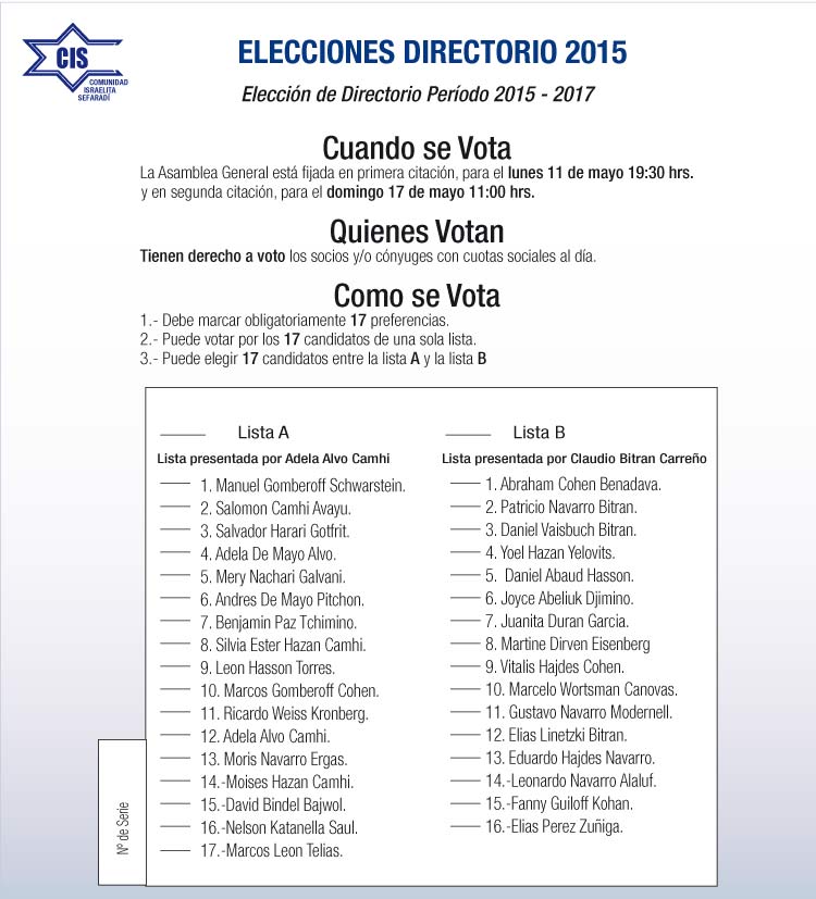 Hoy, para alegría nuestra, este escollo que tanto nos ha pesado y limitado, ha sido reemplazado por nuevos bríos, lo que nos lleva a anunciar con gran regocijo, que para las elecciones del 17 de Mayo, tenemos 33 nombres dispuestos a aceptar el desafío que nuestra conciencia judía nos reclama. Éramos 34, divididos en dos listas de 17 cada una, pero, por razones estatutarias, el comité electoral, en una muestra de la seriedad con que ha tomado el cargo, ha objetado a uno de los candidatos de la lista B, de manera que te encontrarás con la lista A con 17 candidatos y la B con 16, lo cual, no constituye problema para ejercer tus derechos de socio al día en tus cuotas sociales (cancelado hasta el 31 de Marzo de 2015) votando por los 17 nombres de tu preferencia, independiente de si van en la lista A o B.