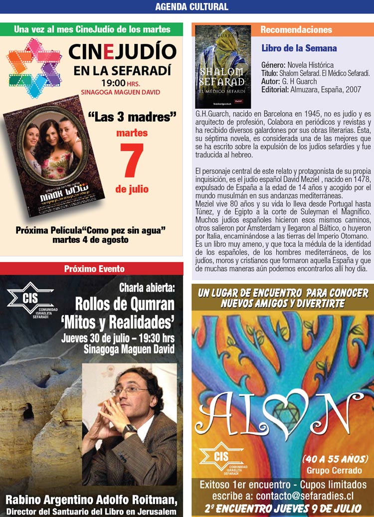 Keridos lectores, Siguiendo con el ciclo de CineJudío de los primeros martes de cada mes, esta próxima semana tendremos un film y un posterior debate muy interesante que se realizará el martes 7 a las 7 p.m. proyectaremos LAS TRES MADRES, y a continuación los comentarios del cineasta Leonardo Navarro, quien realizará un análisis basado en las interpretaciones de cada espectador. Los integrantes del nuevo Directorio ya llevan casi 45 días a cargo del liderazgo y conducción de la Comunidad. Están trabajando en equipo pero dentro de una red de varias comisiones que se reúnen, y planifican varios proyectos, algunos a corto plazo como fortalecer la cultura sefaradí, realizar más actividades para adultos, manteniendo siempre las tradiciones y la cultura judía; y otros proyectos a mediano y largo plazo como reconquistar a los antiguos socios y la incorporacion de nuevas familias. Además proyectos exclusivos para jóvenes y adultos jóvenes, entre otros, que daremos a conocer pronto. También hay una comisión dedicada a estrechar vínculos con otras comunidades e instituciones, embajadas y organizaciones gubernamentales. La Comunidad Israelita Sefaradi lamenta el sensible fallecimiento del Próximamente, tal como ha pronosticado el servicio meteorológico se viene la lluvia tan esperada y a continuación.... el frío! así que a cuidarse, mantenerse abrigaditos para no contagiarse de tantos resfríos. Este fin de semana tendremos la final del fútbol de la Copa América: “Chile vs. Argentina”. Gane quien gane disfrutemos en familia y con amigos este evento deportivo que siempre es una buena excusa para el encuentro, de la pasión por la camiseta y porque no? un poco de humor también. Semana saludosa a todos! Shabat shalom Kelly Armoza |