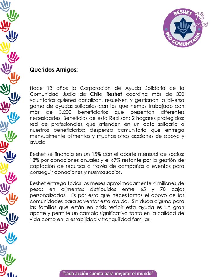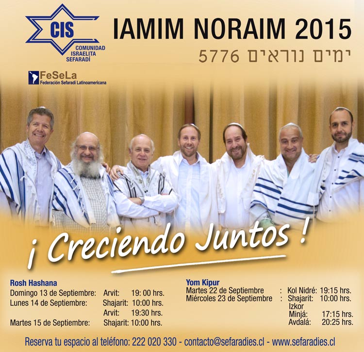 El año pasado realizamos el anuario 5774 de nuestra Comunidad y ha sido motivo de profundo orgullo, pues ha sido una labor de gran esfuerzo que fue reconocida por la amplia participación y positiva respuesta por parte de nuestra Comunidad. A través de este Anuario, mostraremos las actividades y eventos que se han realizado durante el 5775 con nuestros socios, el legado sefaradí siempre presente en cada momento. Además informaremos los proyectos para el 5776 , promoviendo siempre la unidad, la interacción social y mutua colaboración. Es por ello que te invitamos, por segundo año consecutivo, a integrarte y ser parte, publicando en el Anuario de la Comunidad Sefaradí, y así podrás llegar con tu mensaje personal, familiar; o si prefieres mostrar producto, servicio o empresa a una selecta base de más de 300 familias judías. Para tal efecto, comunícate directamente con Kelly Armoza, Directora Ejecutiva de la CIS por tel al 222 020 330 o por mail a directoraejecutiva@sefaradies.cl y podrás ver todos los detalles referentes a la publicación. Cierre de edición: 1° de septiembre 2015 |