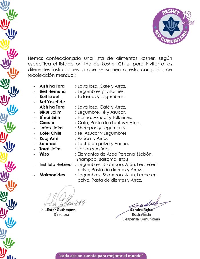 LEILUI NISHMAT Para honrar la memoria de un ser querido se acostumbra hacer tzedaká a los más necesitados u ofrecer un kidush comunitario, en Kabalat Shabat o en Shajarit de Shabat. Si estás interesado en hacerlo o deseas informarte al respecto, por favor contáctate al tel 222 020 330 anexo 200/300 o contacto@sefaradies.cl |
