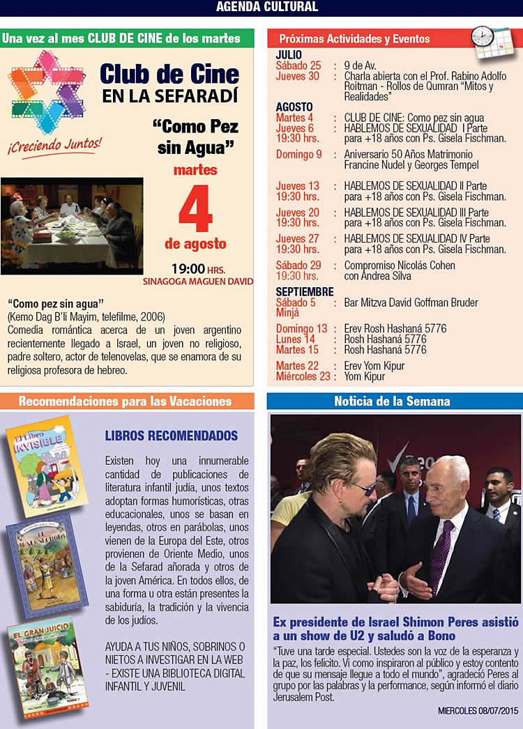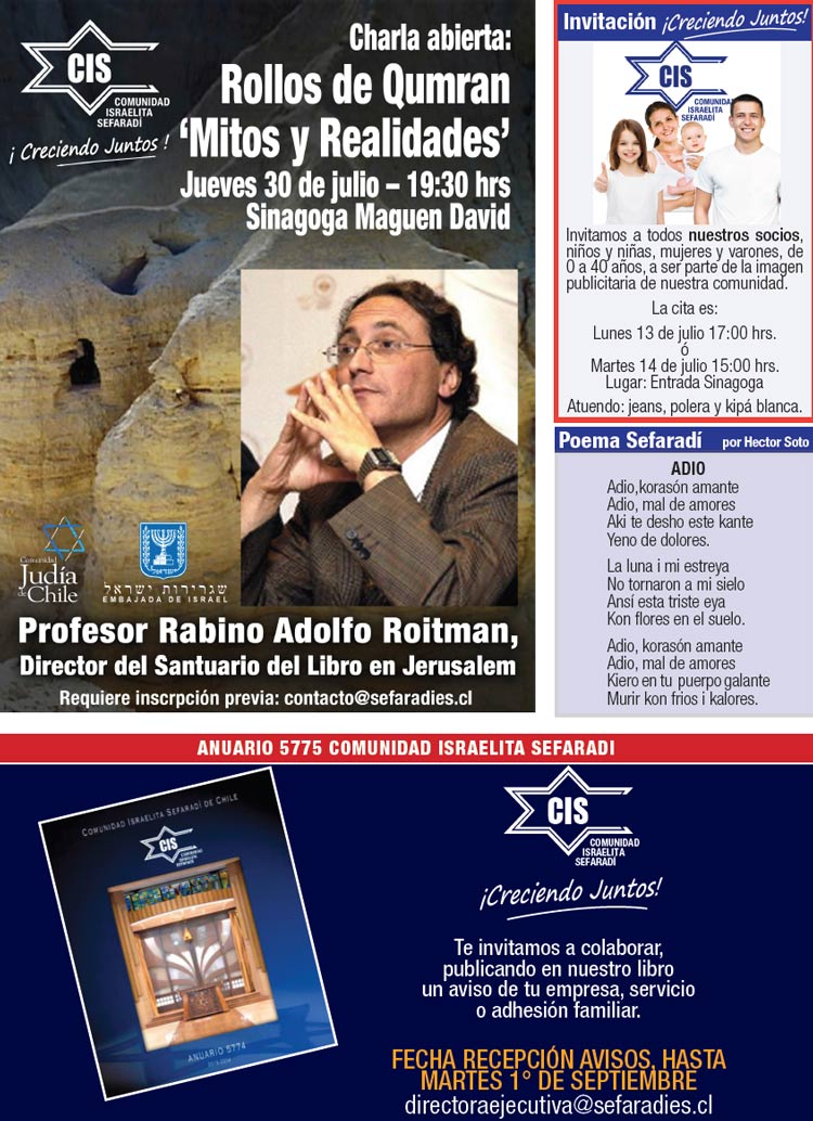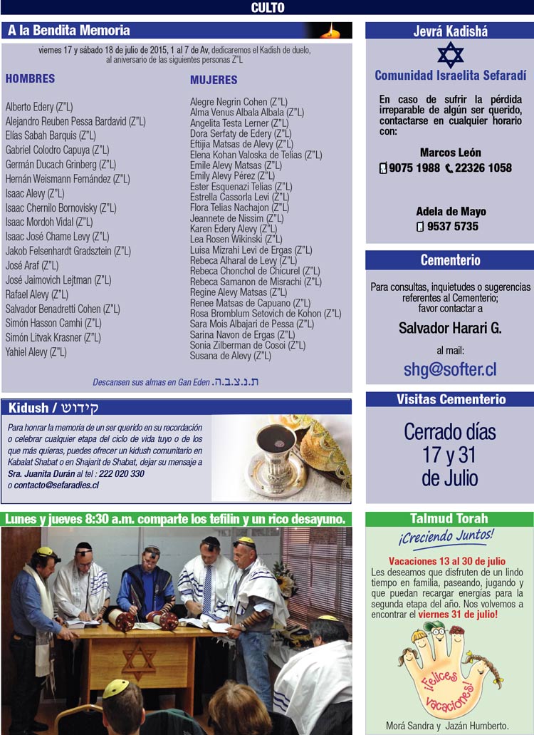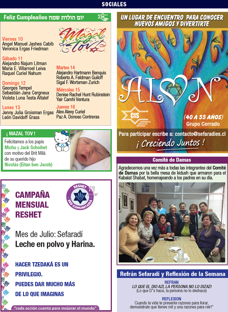 Keridos lectores, Falta poco para las Altas Fiestas. La Comunidad Israelita Sefaradí lamenta el sensible fallecimiento de la Sra. Paulina Dicowsky Sircovich (Z”L) Nuestras más sinceras condolencias a su Marido Sr. Leonardo Bitran Bitran , a su hija Hannah, a sus hijos Ricardo y Gabriel, a sus 10 nietos, 3 bisnietos y a toda la familia. Según el servicio meteorológico, se viene un fin de semana de lluvia y frío, apropiado para degustar algunas exquisiteces, los niños en vacaciones, algunas salidas o reuniones con amigos y familia. Buen fin de semana con salud y alegrías! |