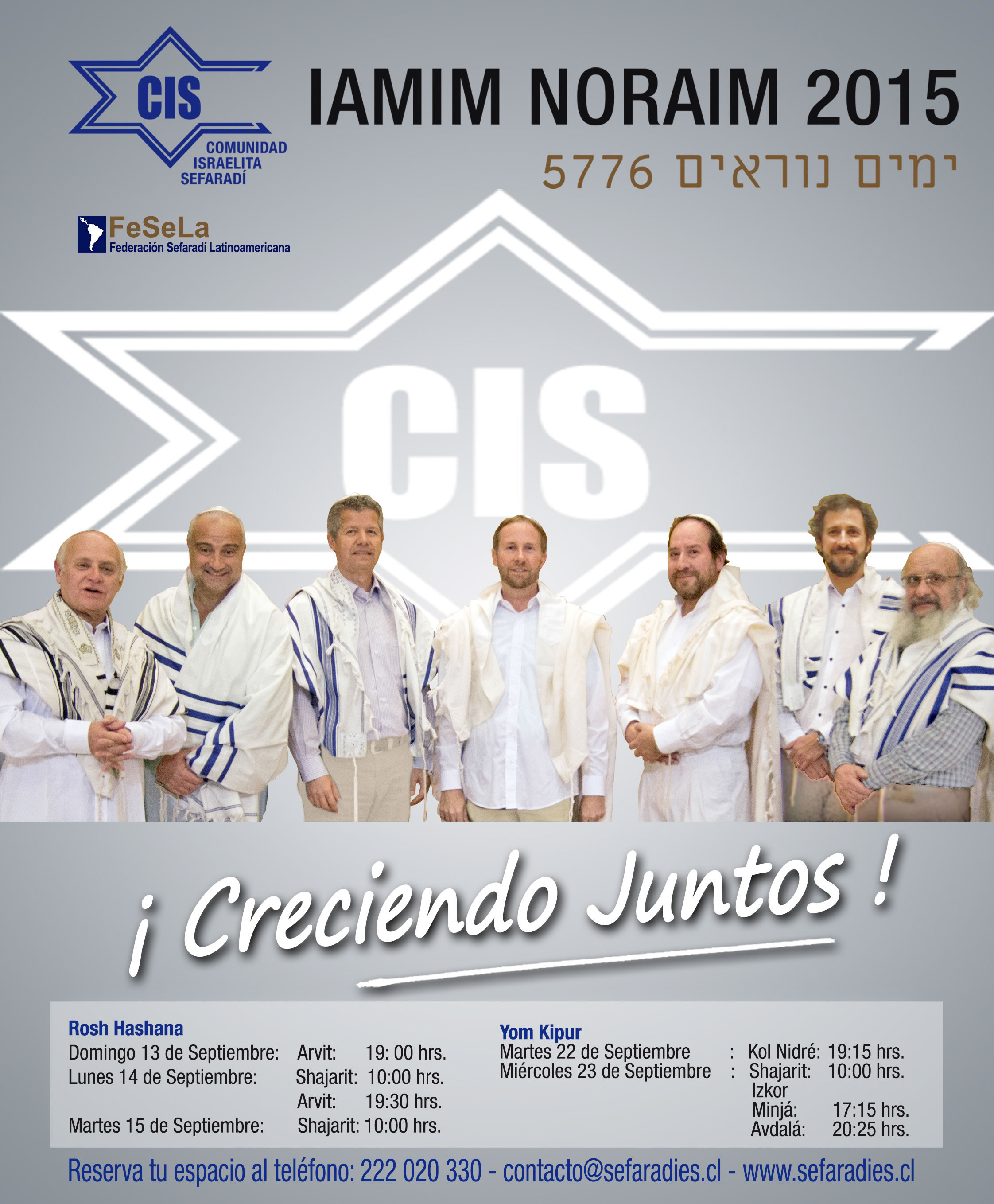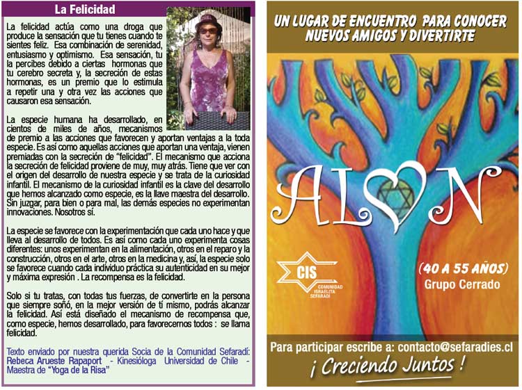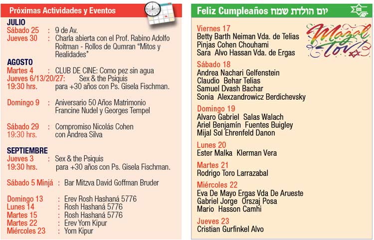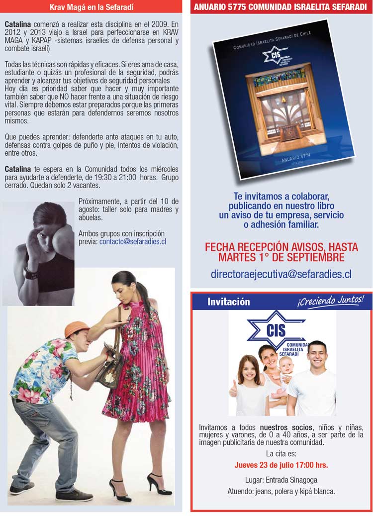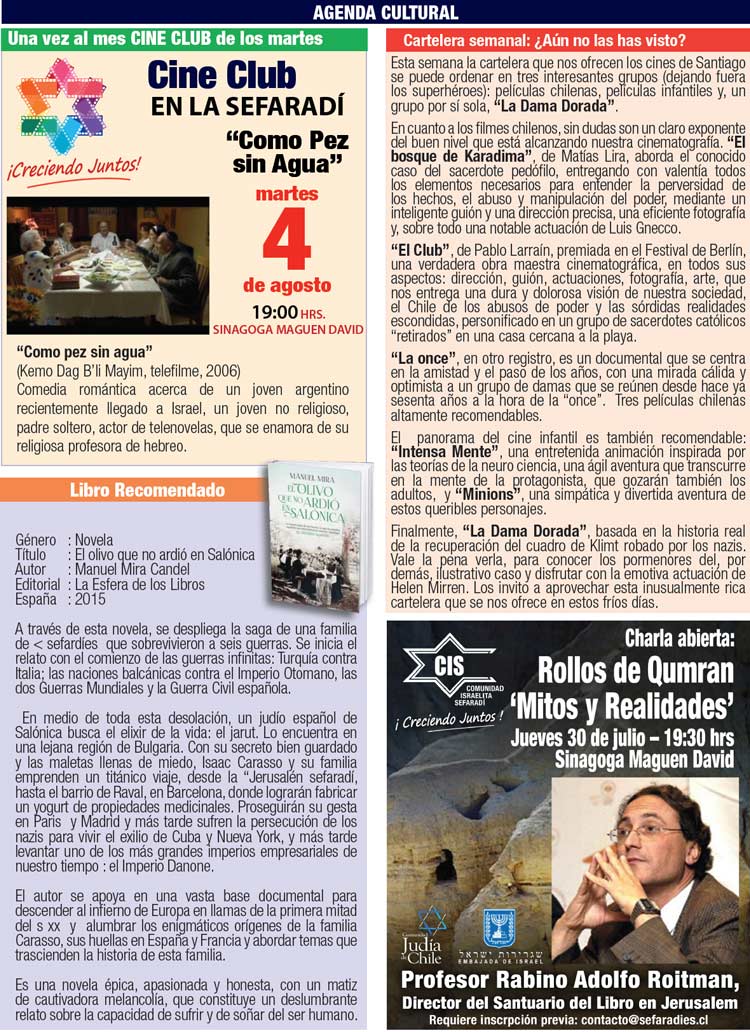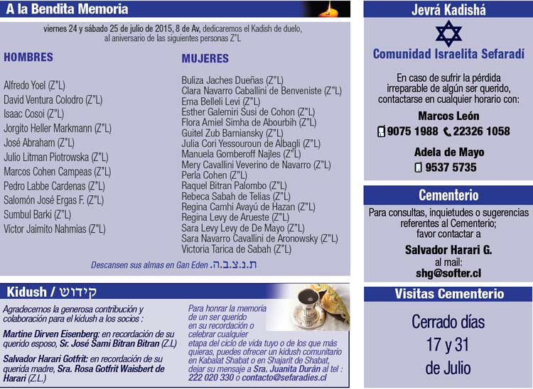 Queridos lectores, La Comunidad Israelita Sefaradi lamenta el sensible fallecimiento del Sr. Manuel Cohen Jaches (Z”L.). Nuestras más sinceras condolencias a su esposa, Sra. Gloria Telias y a toda la familia. En esta oportunidad me extenderé un poco para contarles algo que personalmente llega a mi corazón y en especial en esta fecha. Recordar para que no vuelva a pasar, nunca más, en los años venideros ningún acto que refleje la mayor expresión humana de odio que hace no tantos años atrás provocó un exterminio masivo. Para esto, es necesario educar a las generaciones futuras, a las presentes y a nosotros mismos, eliminando el odio y el racismo que tantos años acompañó al pueblo judío. Me despido recordándoles que así como tendremos actividades durante todo agosto y parte de septiembre, falta un poco mas de un mes y medio para Iamim Noraim y ya se ve como de a poco se van ocupando los espacios para Iom Kipur. En la oficina de la Comunidad contamos con un plano gigante, para que puedas ver las ubicaciones y hacer las reservas con tiempo, de lugares para tu familia y cerca de tus amigos. Para aquellos que no han podido llegar a tomarse la foto esta semana, debido al mal tiempo o por estar de vacaciones; los invitamos el próximo jueves 23 a las 17:00 horas con jeans y polera o polerón blanco y formar parte de nuestra próxima imagen: ¡Creciendo Juntos! Shabat Shalom |