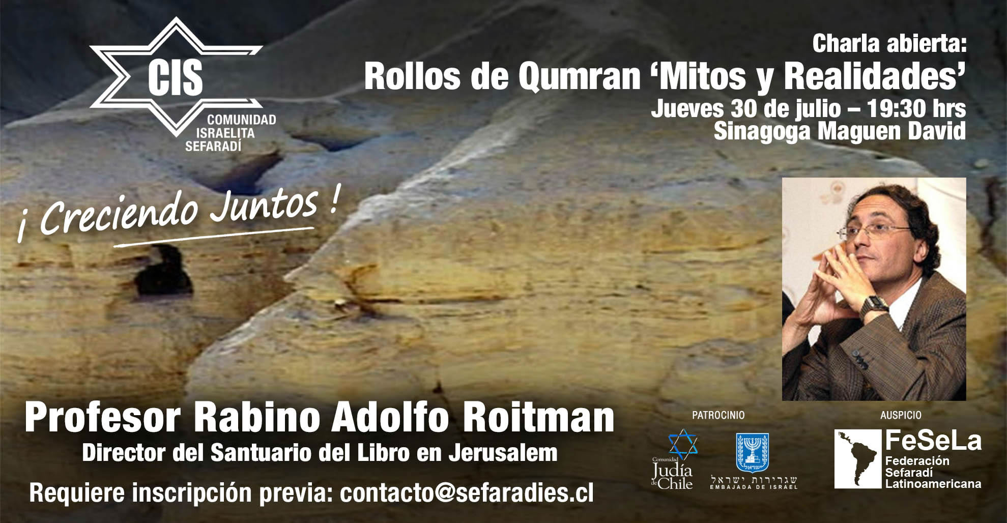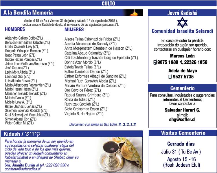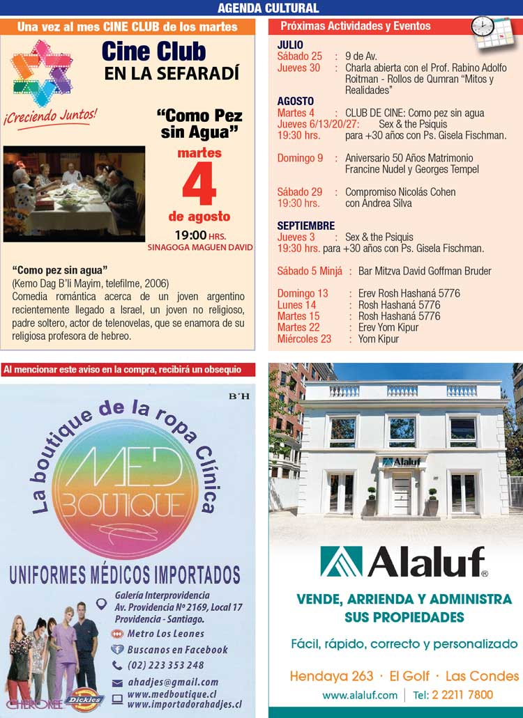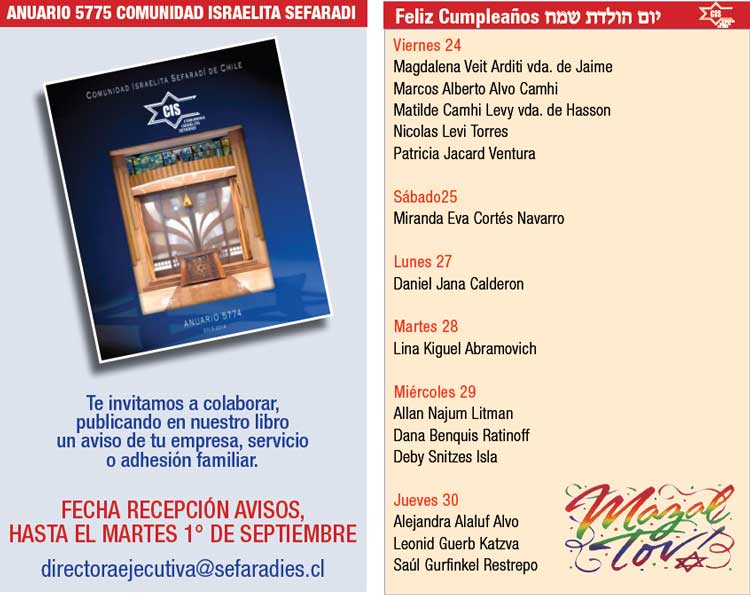 Queridos Lectores El jueves 30 a las 19:30 hrs., la Conferencia del Prof. Adolfo Roitman acerca de los “Rollos de Qumran” Mitos y Realidades. Este importante evento es auspiciado por FeSeLa ( Federación Sefaradí Latinoamericana) y está patrocinada por la Embajada de Israel y la Comunidad Judía de Chile. Estarán presentes autoridades nacionales, como así también embajadores y público de diferentes comunidades. Se requiere inscripción previa contacto@sefaradies.cl El martes 4 a las 19:00 horas, en Cine Club, se proyectará “ Como Pez sin Agua”, comedia apta para todo público y a continuación compartimos junto a un cafecito los comentarios del cineasta, Leonardo Navarro. El jueves 6 a las 19:30 horas, “Sex & the Psiquis” a cargo de la Ps. Gisela Fischman con quien recorreremos durante 5 jueves consecutivos diversos temas, en forma entretenida y dinámica. Esta actividad es solo para mayores de 30 años y requiere inscripción previa. contacto@sefaradies.cl Este último fin de semana recibimos la lamentable noticia del fallecimiento del Sr. León Tchimino Palombo (Z”.L.). En una humilde respuesta a todo lo que él entregó a la Comunidad, este Jadashot será dedicado al querido “León”. Tengan todos una linda semana! Recuerden que los esperamos, para compartir junto a sus amigos, un ciclo de actividades entretenidas y para todas las edades. Shabat Shalom |