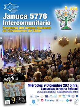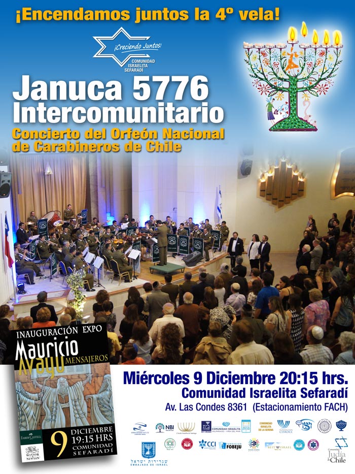 El miércoles 9 a las 19:15 hrs. en nuestra Comunidad comenzaremos con el arte y los bellos murales de Mauricio Avayu quien realizará la inauguración de una nueva exposición, seguido a ésto, a las 20:15 hrs., 50 músicos integrantes del Orfeon Nacional de Carabineros como en años anteriores nos emocionarán con su extraordinaria música y además nuestro Rab Dani y el Presidente Abraham Cohen invitarán a los Rabinos y Presidentes comunitarios a encender la 4ª vela de Januca.