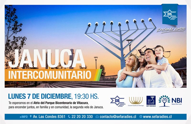 El lunes 7 a las 19:30 hrs. Januca Intercomunitario junto al Círculo Israelita, Bnei Israel, y Beit Emunah encenderemos la 2ª vela de Januca en el Parque Bicentenario.
