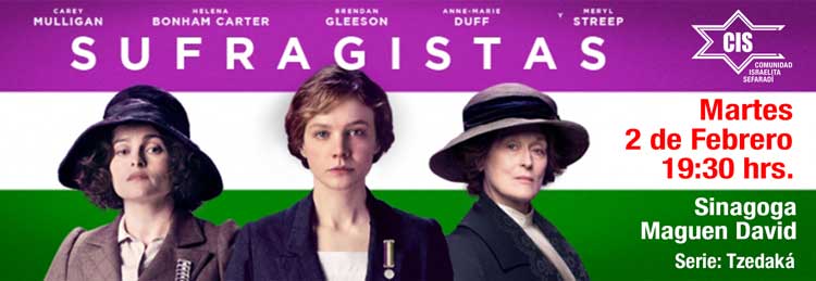 Para comenzar febrero, los invitamos a ver una película estrenada recientemente en los cines titulada “Sufragistas” escrita por Abi Morgan (La dama de hierro) y la participación de excelentes actores, tales como Carey Mulligan, Helena B. Carter y Meryl Streep, entre otros. Un film donde la protagonista vive siendo ninguneada por ser mujer, pero al ser lo normal, no se plantea que pudiera haber alternativas; hasta que conoce a un grupo de mujeres que lucha, con métodos poco ortodoxos, por el voto femenino. Están dispuestas a perderlo todo por la dignidad y la igualdad ante las urnas. No les cuento más!. Solo que ya es una de las favoritas para los Oscar 2016. Los espero para verla juntos el martes 02 de febrero a las 19:30 horas en nuestra Sinagoga.