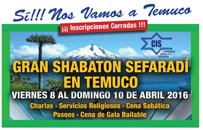 Ya hemos cerrado las inscripciones para el Gran Shabatón de Temuco. El próximo Kabalat Shabat parte de nuestros socios estarán en este histórico encuentro de comunidades sefaradíes. Santiago - Temuco y Puerto Mont. A todos les deseamos buen viaje y disfruten esta bella iniciativa de viajar juntos.
