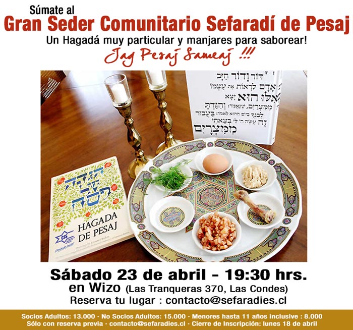 Estamos a pocos días de PESAJ y ya estamos reservando las ubicaciones para el 2do Seder . Si desean tener una mesa con una ubicación preferencial, no olviden llamarnos y reservarla a la brevedad. Este año queremos innovar así que realizaremos nuestro evento en las instalaciones de Wizo, a pocos metros de la Comunidad. Leeremos la Hagadá, comeremos rico y tendremos música y canciones para compartir.