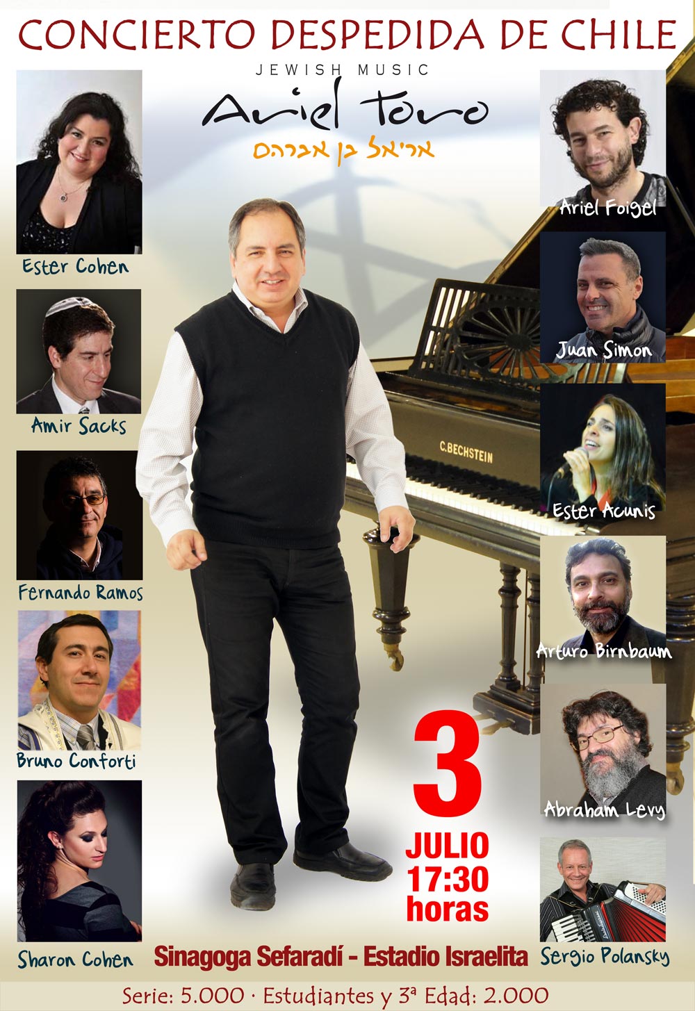 Domingo 3 Concierto despedida de Ariel Toro junto a los artistas: Ariel Foigel, Bruno Conforti, Amir Sacks, Fernando Ramos, Abraham Levy, Arturo Birnbaum, Juan Simon, Ester Cohen, Ester Acunis, Sharon Cohen y Sergio Polansky.