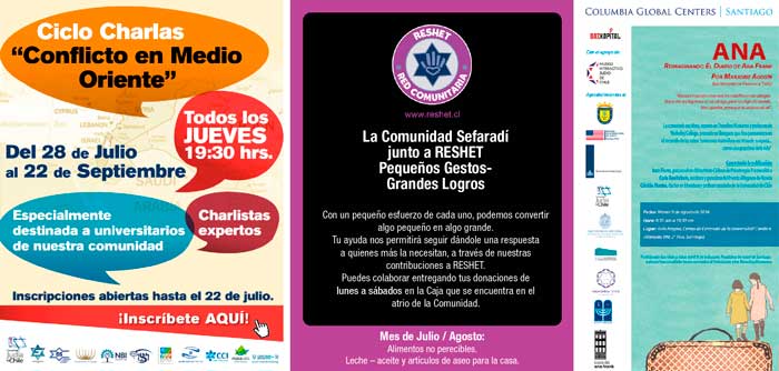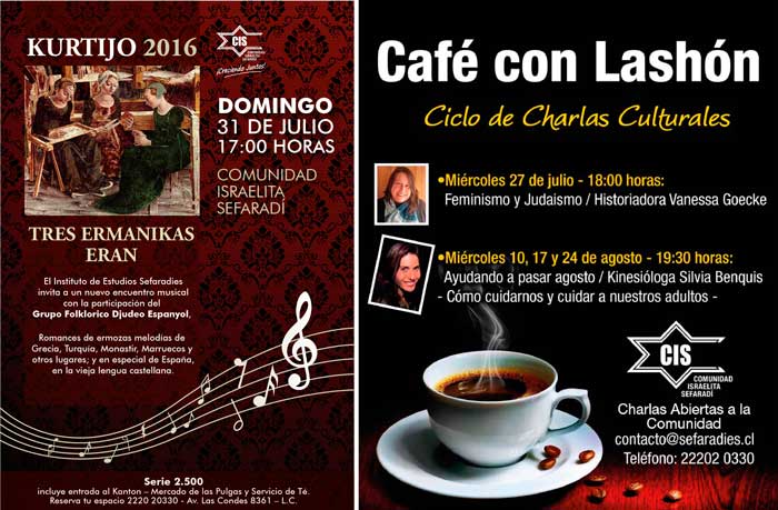 A pocos días de finalizar las vacaciones de invierno, ya nos preparamos para recibir el segundo semestre del año con una serie de actividades de culto y culturales que serán imperdibles; desde las charlas de Café con Lashon el próximo miércoles con la historiadora Vannesa Goecke y durante agosto con la Kinesiologa Silvia Benquis, el Kurtijo 2016 el domingo 31 donde el Grupo Folkloryco Djudeo Espanyol están ensayando desde hace semanas para presentarnos la famosa comedia musical “Tres Ermanikas Eran” y a continuación habrá un sabroso té, bocaditos y un imperdible Mercado de Pulgas donde encontrarán detalles muy atractivos que estarán para no perdérselos.
