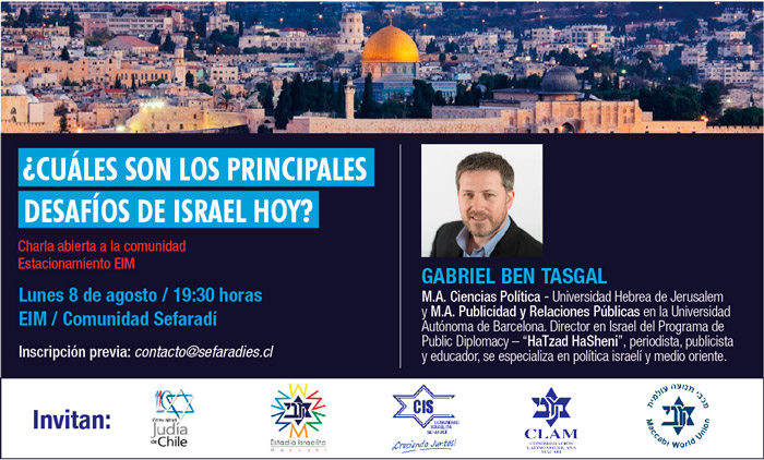 Lunes 8 19:30 hrs. Charla con Gabriel Ben Tasgal ¿Cuáles son los principales desafíos de Israel hoy?