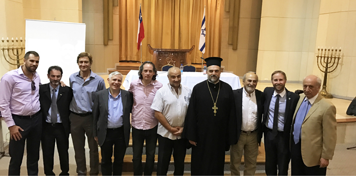En la imagen: Marcelo Isaacson CJCH, Rabino Efraim Rosenzweig, Oscar Kleinkopf (Presidente del Consejo Chileno israelí), Abraham Cohen (Presidente CIS), Padre Gabriel Naddaf y acompañantes, Roberto Muñoz (Presidente Keren Kayemet), Rabino Daniel Zang y el socio Samy de Mizrahi.