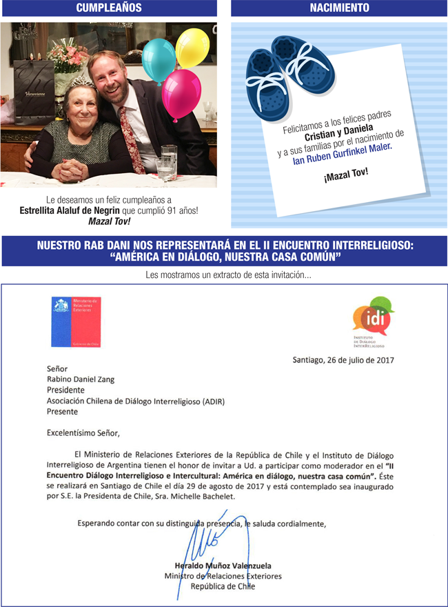 Finalmente, nos sentimos muy orgullosos por nuestro Rab Dani, ya que recibió una invitación oficial del Ministro de Relaciones Exteriores, Sr. Heraldo Muñoz, para participar como expositor en el “II Encuentro Diálogo Interreligioso organizado, justamente, por la Asociación Chilena de Diálogo Interreligioso (ADIR), a realizarse este 29 de Agosto. Dani, nuestras más sinceras felicitaciones, no hay duda que estaremos muy bien representados, mucho éxito!!!