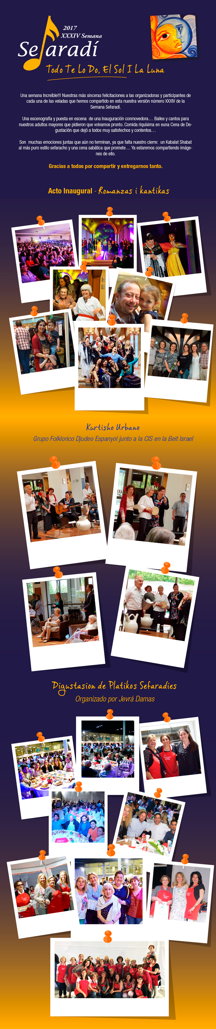 Una nueva semana y ¡¡¡QUÉ SEMANA!!! Ha sido un trabajo arduo de las comisiones y colaboradores de la CIS, pero bien ha valido todo el esfuerzo. En nombre del equipo y de la Comunidad, van nuestros agradecimientos, especialmente a Mery quien ha liderado esta 34ª Semana Sefaradí partiendo por una Inauguración increíble y a Adela de Mayo quien, junto a su grupo de Jevrá, nos ha entregado una linda y exquisita Cena de Degustación. Por supuesto, no olvido la linda jornada en Beit Israel donde nuestros cantores se lucieron e hicieron cantar no solo a los adultos mayores, sino a todos quienes estuvimos presentes.