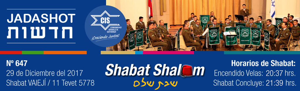 Estamos ad portas de despedir este 2017, lleno de actividades, celebraciones y rituales, algunos de ellos, tan nuestros. Cómo olvidar la XXXIV Semana Sefaradí. Estuvo impecable desde el momento mismo de su Inauguración!!! Los matrimonios, nuestros Bar Mitzvot, cumpleaños, visitas a otras instituciones y celebraciones, asambleas Rabínicas, etc… Si hasta colaboramos en la presentación de un reportaje de la Fundación Kulám, tuvimos presentaciones de Rikudim junto a la NBI. La lista es, gratamente, enorme. Finalizamos con un Jánuca muy celebrado no solo acá, con el Orfeón de Carabineros, sino participando del encendido de velas en otras instancias, junto a nuestras Comunidades amigas.