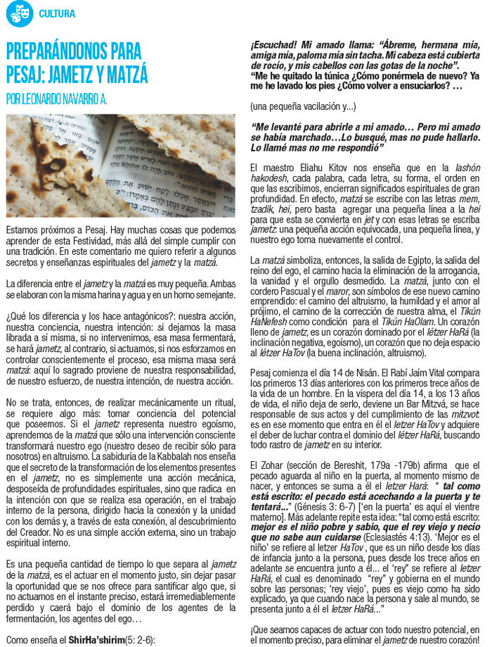 Este shabat hagadol leemos en la Tora la segunda parasha del libro de Levítico, la parasha Tzav. La palabra tzav significa ordena, y es la raíz de la palabra mitzva mandamiento. También puede significar unión, por lo que uniendo ambas acepciones podemos explicar que a través de la observancia de los mandamientos puedes unirte al Creador y traer armonía al mundo en el que habitas.