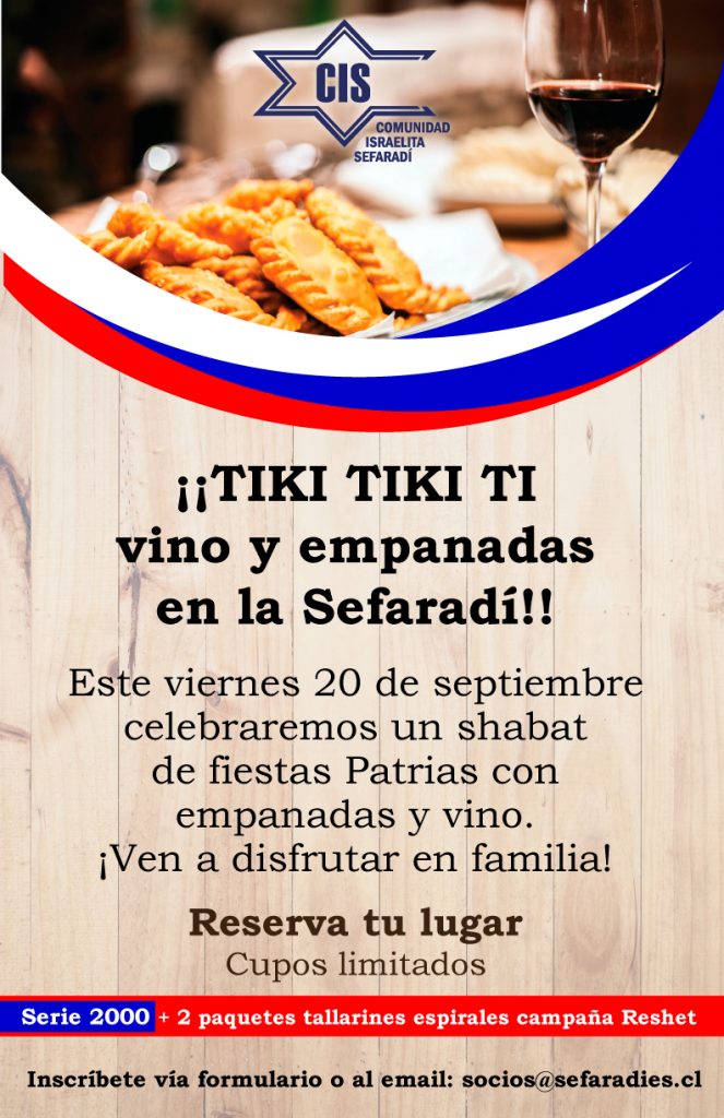 Este viernes 20 de septiembre celebraremos un shabat de fiestas Patrias con empanadas y vino.…