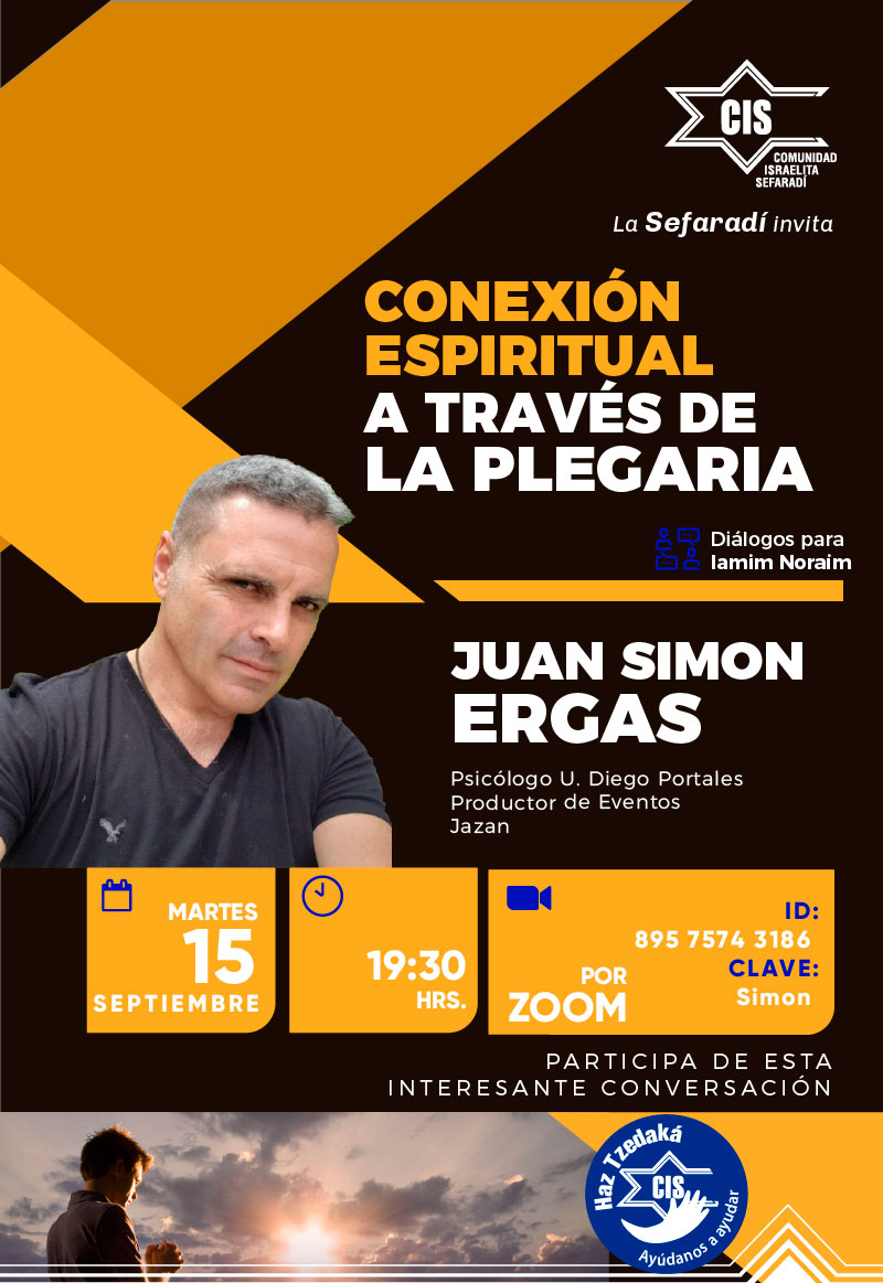 ::Nueva Fecha :: Te invitamos a conectarte al Zoom el próximo martes 15 de septiembre a las 19:30 hrs., a este nuevo ciclo para “Diálogos para Iamim Noraim”, con nuestro invitado de la semana, el Psicólogo y Productor de Eventos JUAN SIMON ERGAS, con quien conversaremos sobre el tema: Conexión Espiritual a través de la Plegaria.